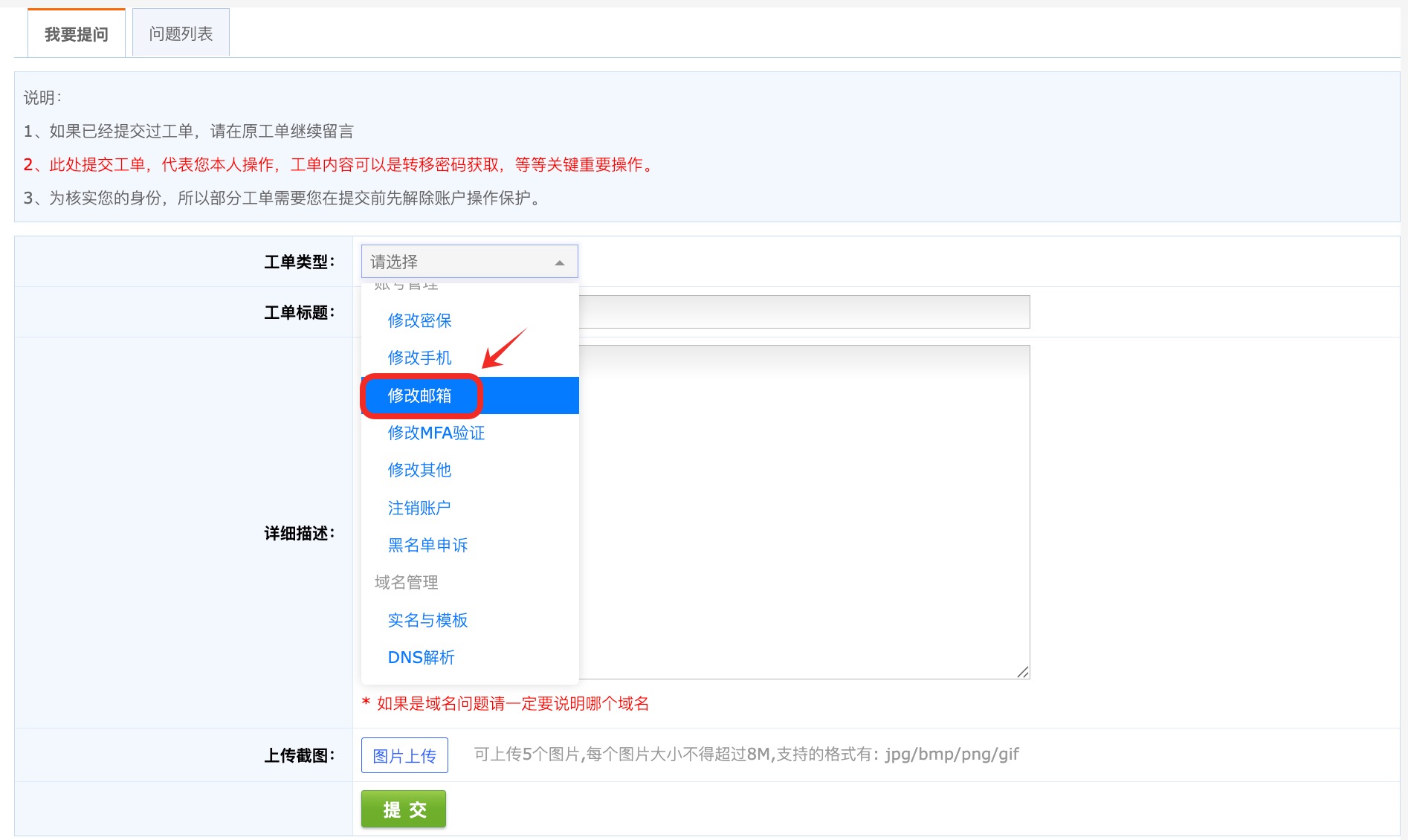 ②“工单标题”填写您的需求,如:更换账户邮箱;