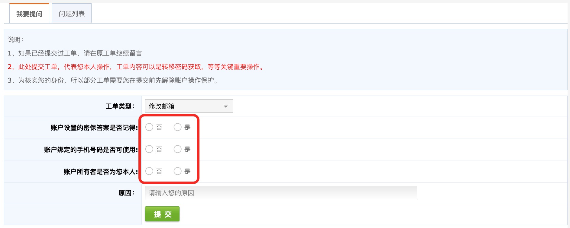 账户邮箱作为登录本站的账户凭证,需谨慎保管!如因特殊原因需要修改邮箱,请提交【有问必答】按照有问必答内容要求填写相关信息并提供相应截图等待专员审核处理(暂不支持自助修改),具体流程如下: